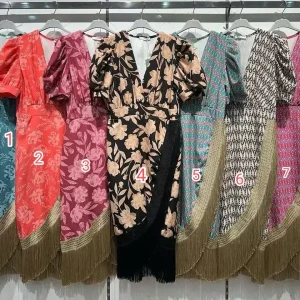 Vestido escote pico flecos.