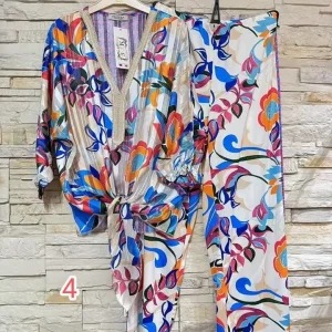Conjunto de pantalón y bomber de satén estampados.