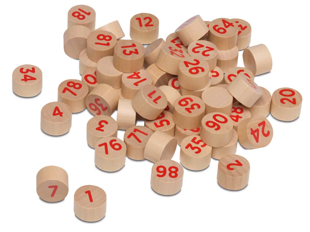 Son fichas de madera con los números hasta el 90, grabados por una cara. Tienen un tamaño más grande del habitual para que sea más fácil verlas y cogerlas.
