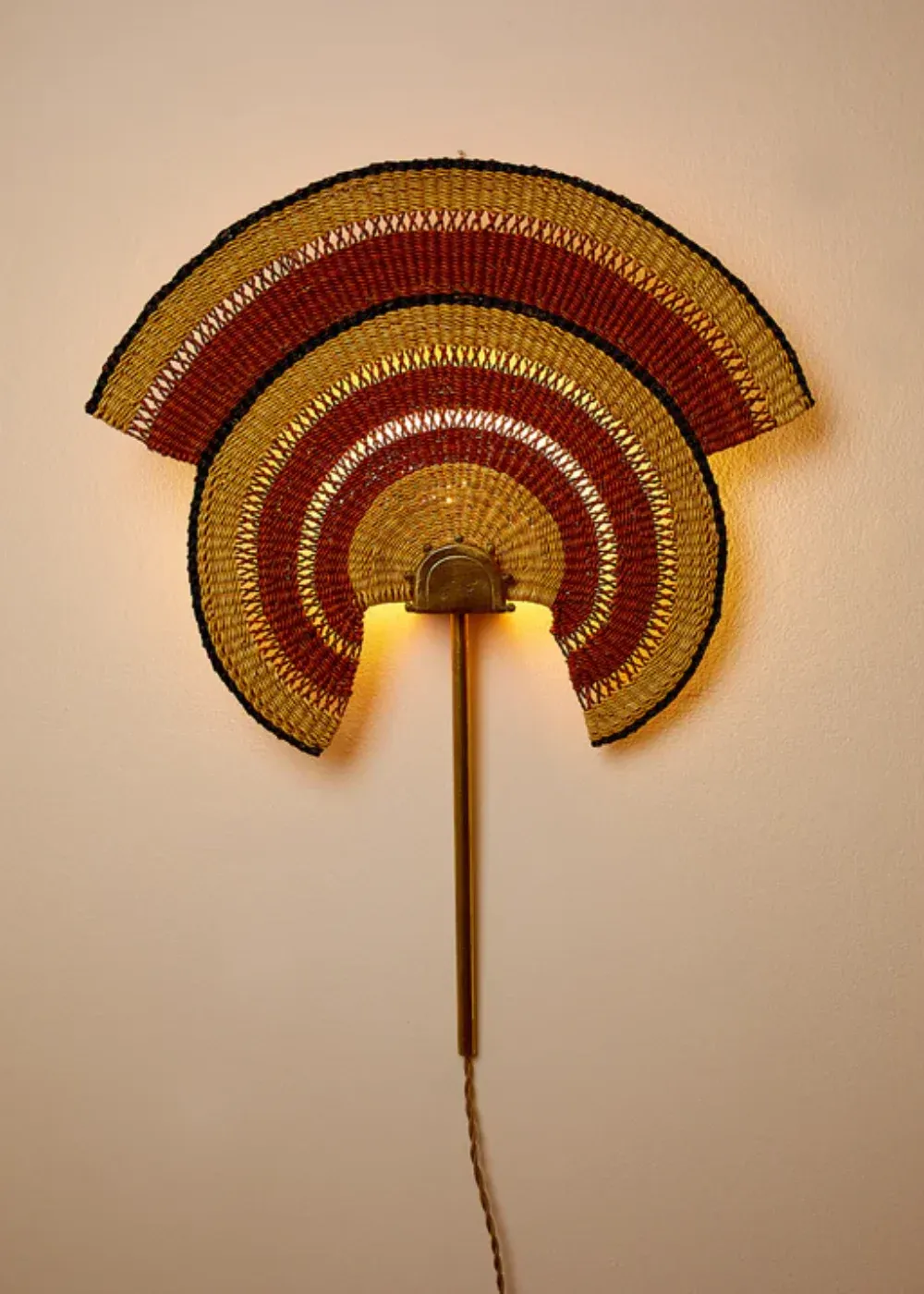 Este aplique de pared abstracto se basa en un abanico tradicional, con su delicado tejido crea un brillo dorado y con su accesorio de latón artesanal es una decoración impresionante para su pared que decorará su hogar con originalidad cuando esté encendido o apagado.