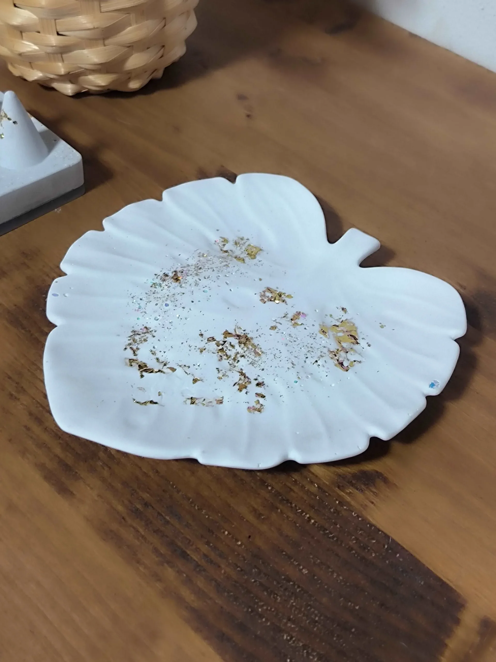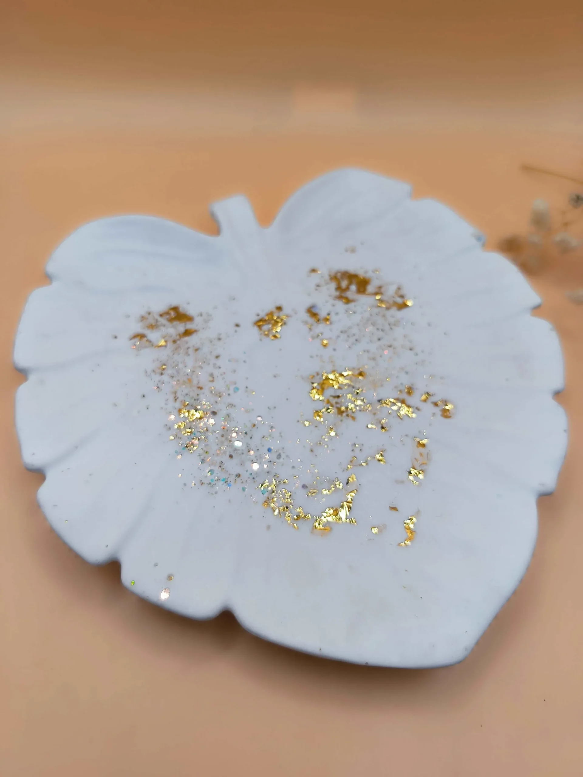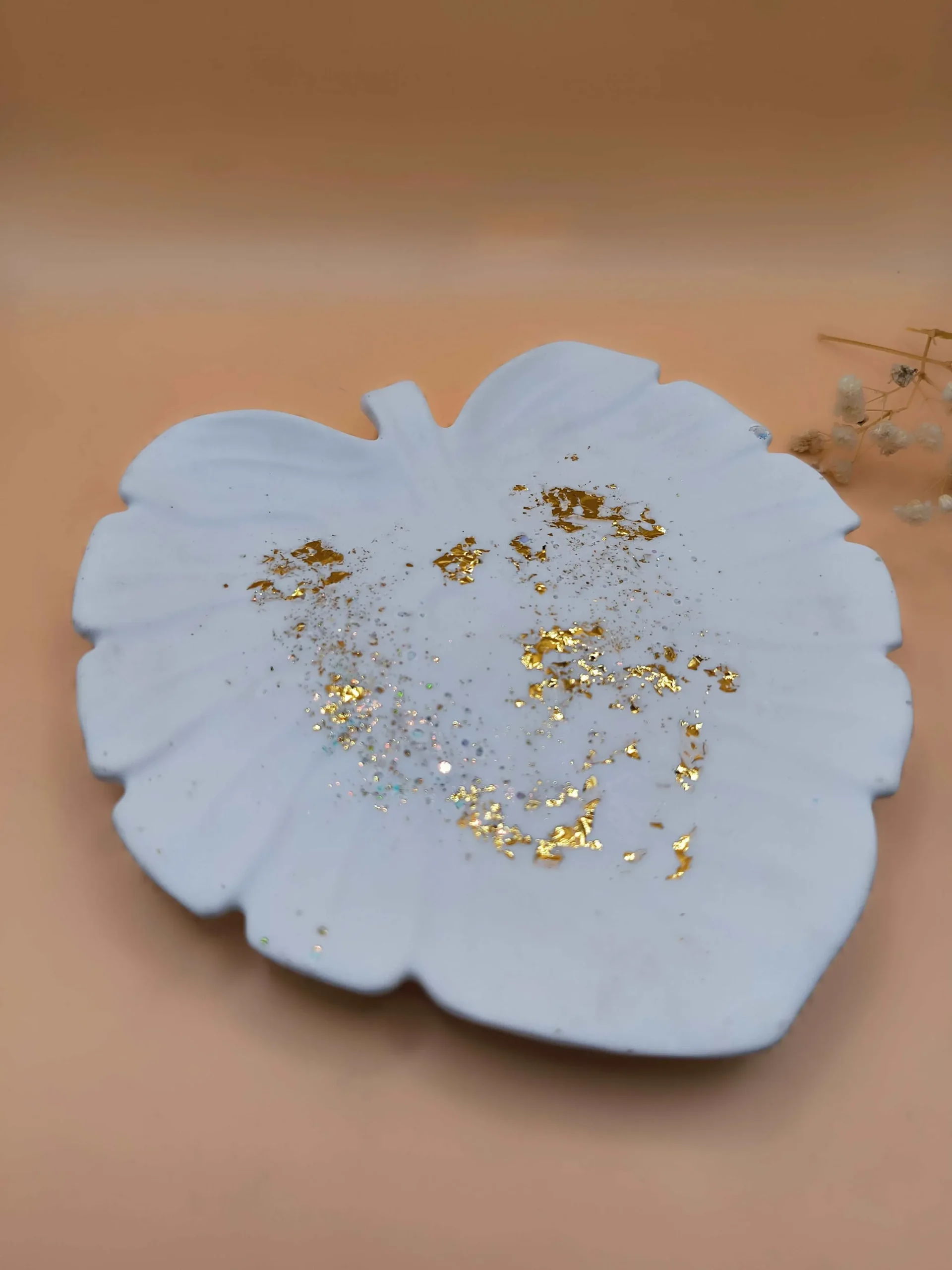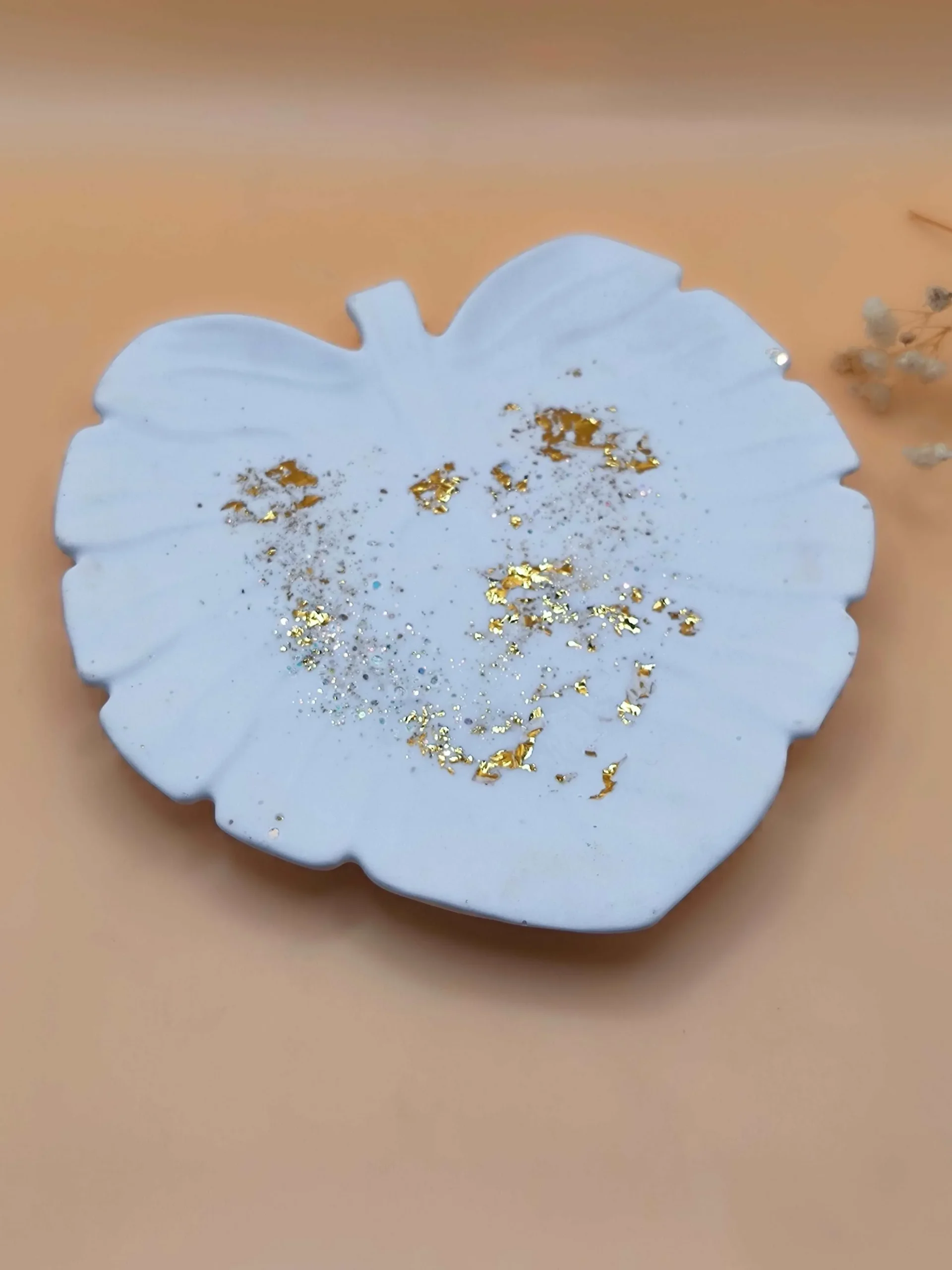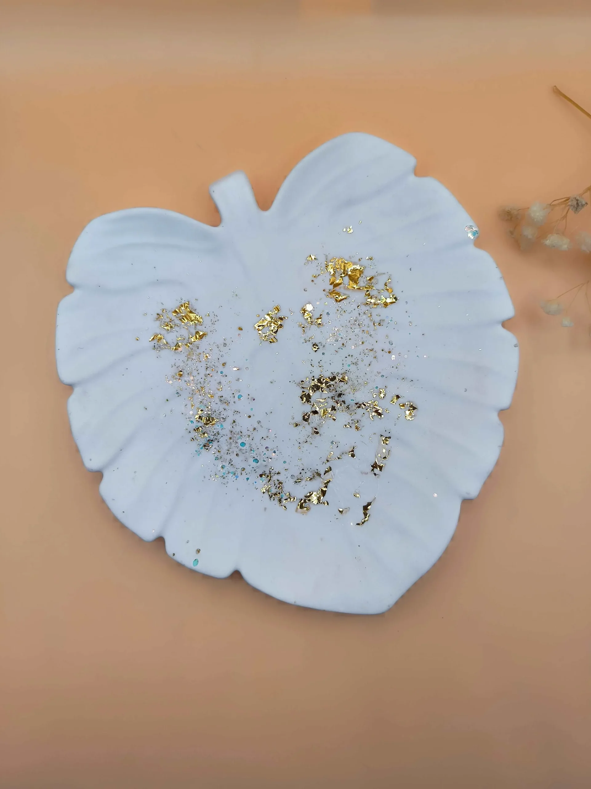 - Diseño: Forma de hoja con detalles en pan de oro y purpurina, que aportan un brillo elegante y un toque de lujo.