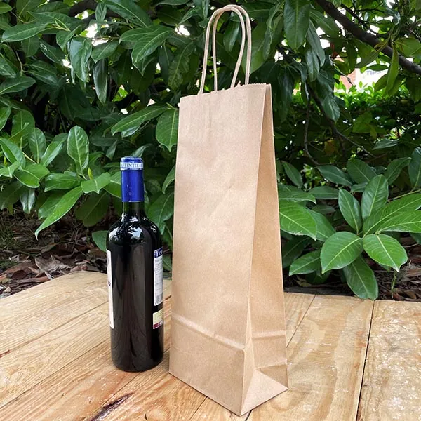 Bolsa para botellas con asa rizada en papel kraft reciclado de 110 g. Excelente capacidad y resistencia.