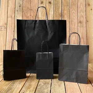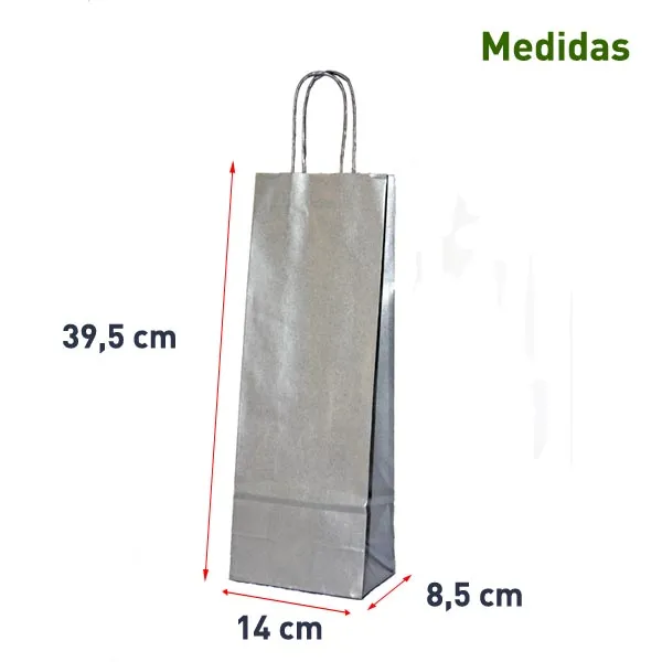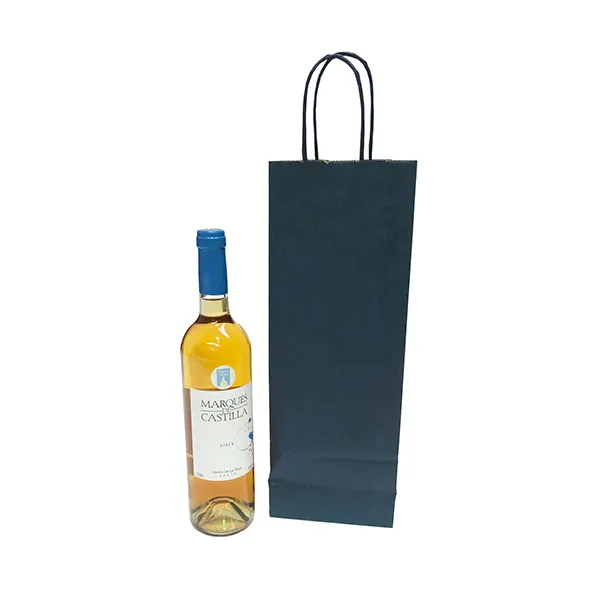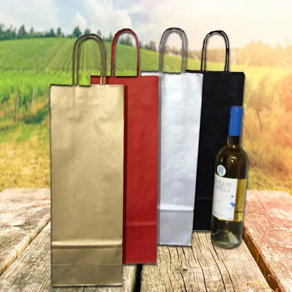 Bolsas de asa rizada portabotellas. Las bolsas oro y plata tienen el interior blanco. Las bolsas roja, negra, azul, granate y verde son en papel kraft con interior marrón.