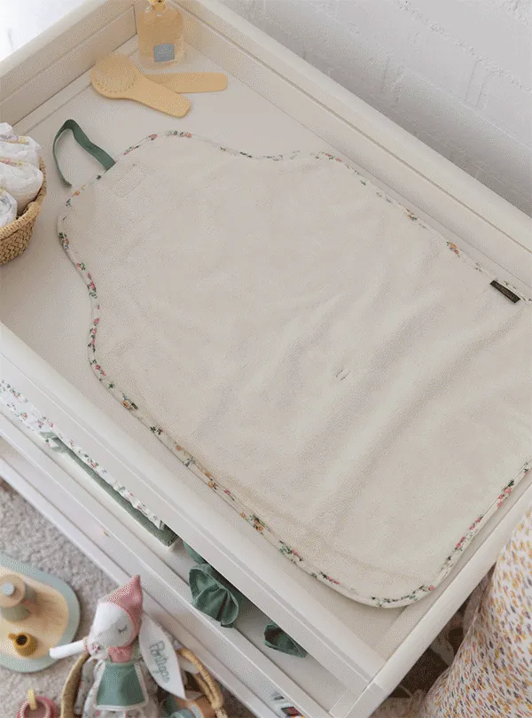 Además de su bonito exterior, el cambiador con popelin verde con el tejido Liberty London (algodón 100% orgánico), su interior con toalla de algodón y bambú permite cambiar al bebé sobre una superficie ultra suave y ligeramente acolchada gracias a su rizo de más de 300gr/m2.