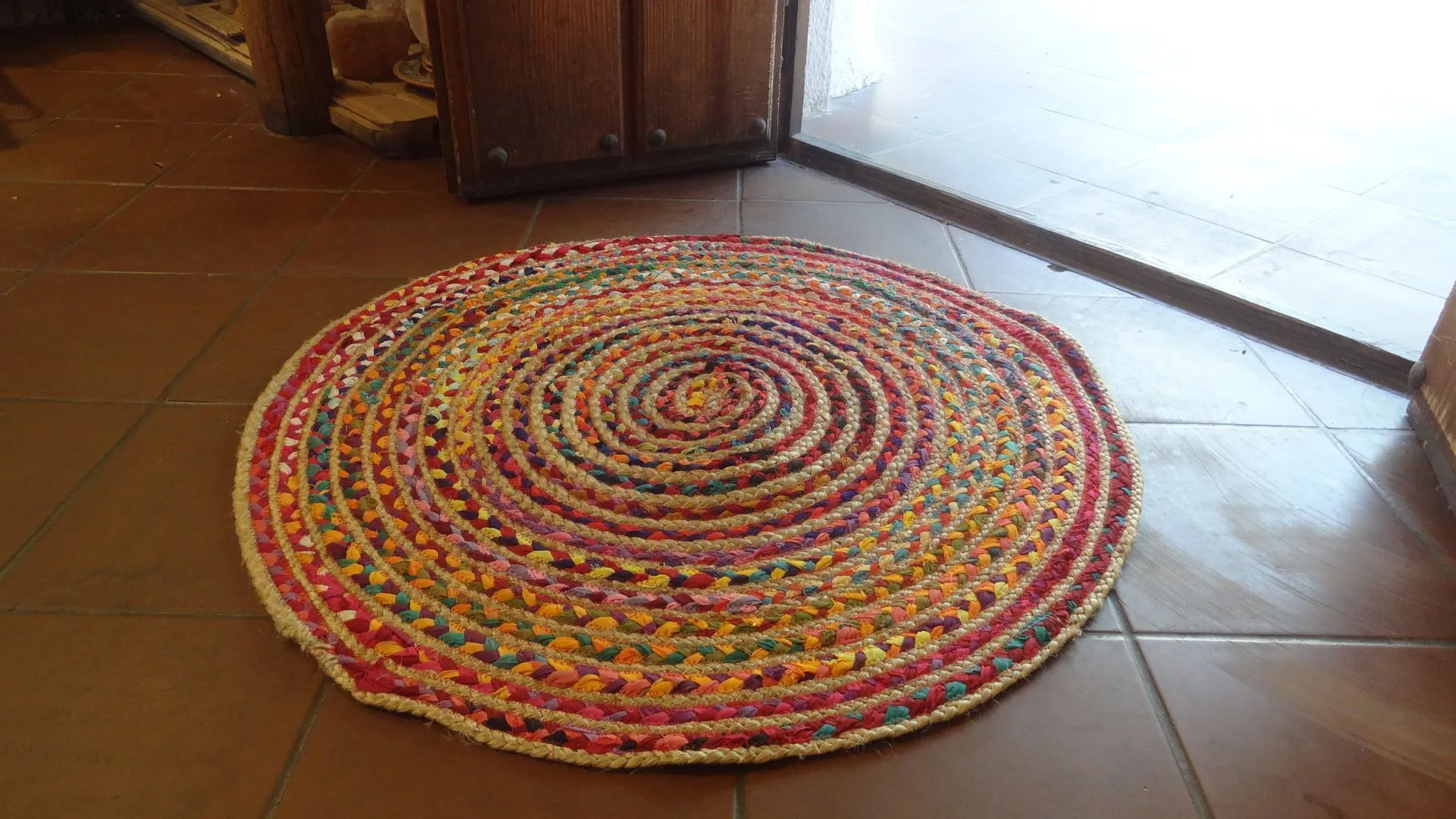 Esta alfombra esta tejida con jute mezclado con tela de diversos colores, Diámetro 120 cm.