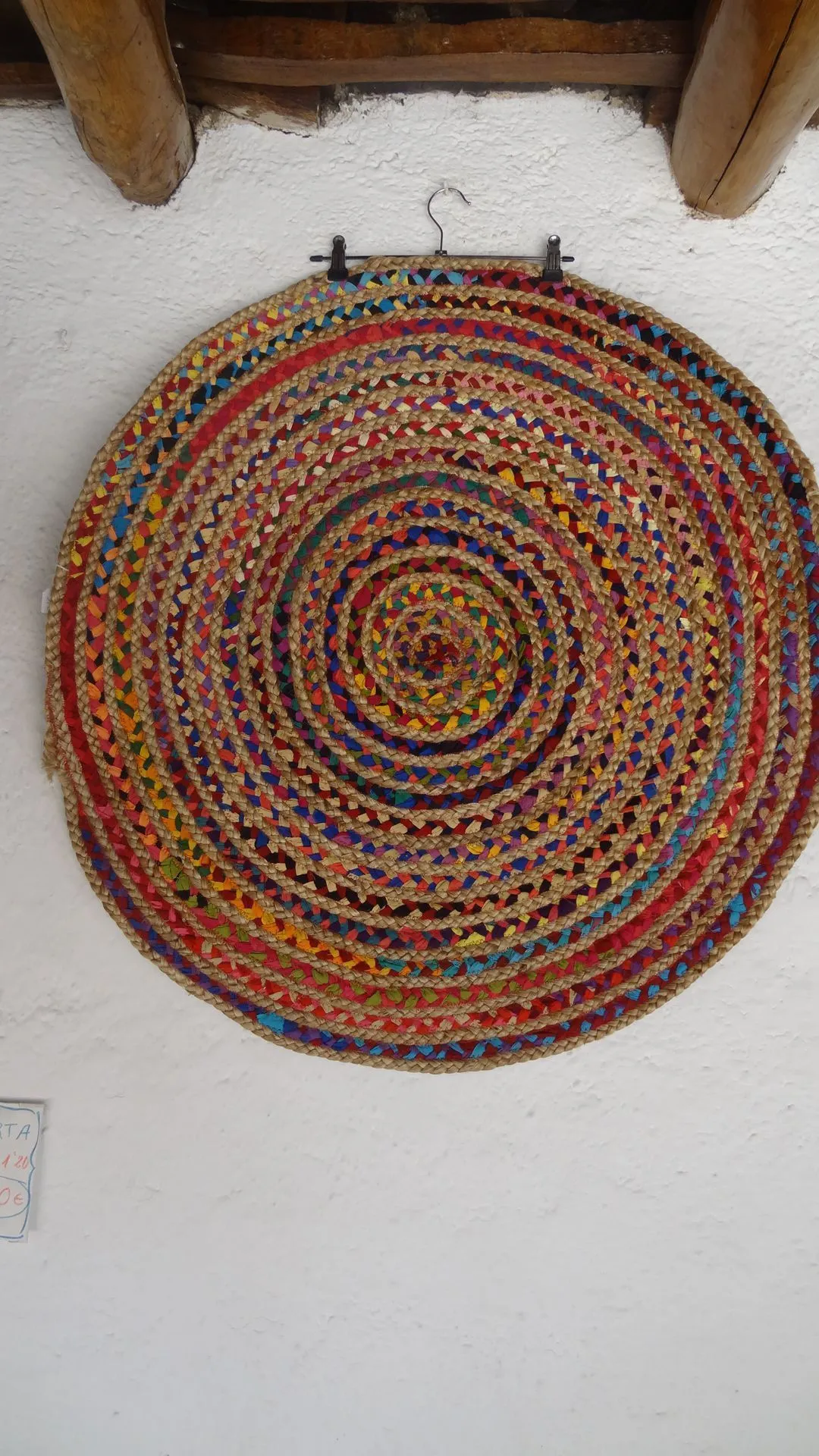 Esta alfombra esta tejida con jute mezclado con tela de diversos colores, Diámetro 90 cm.