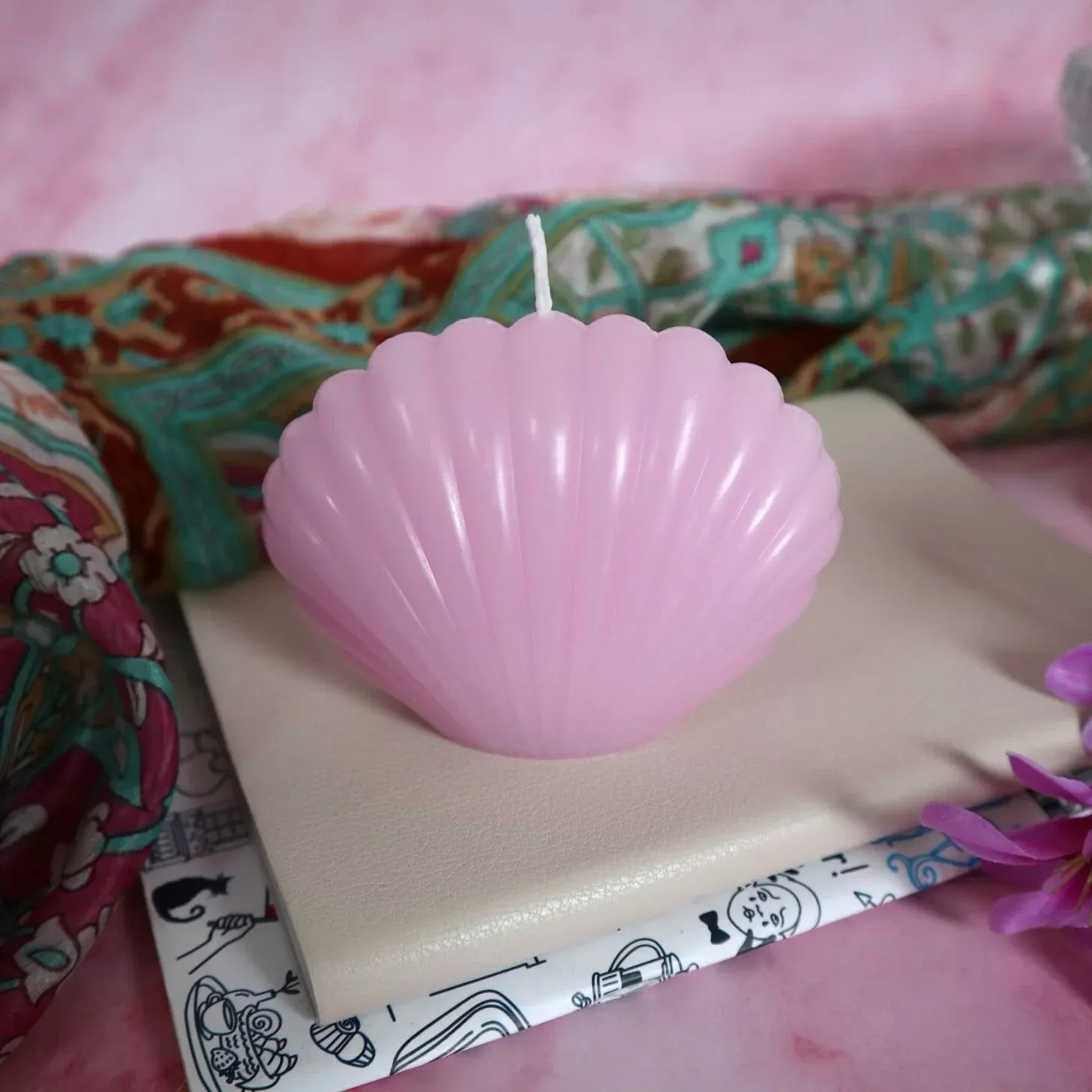 Vela ligeramente perfumada en forma de concha en blanco y tonos pastel azul, rosa, verde y lila.