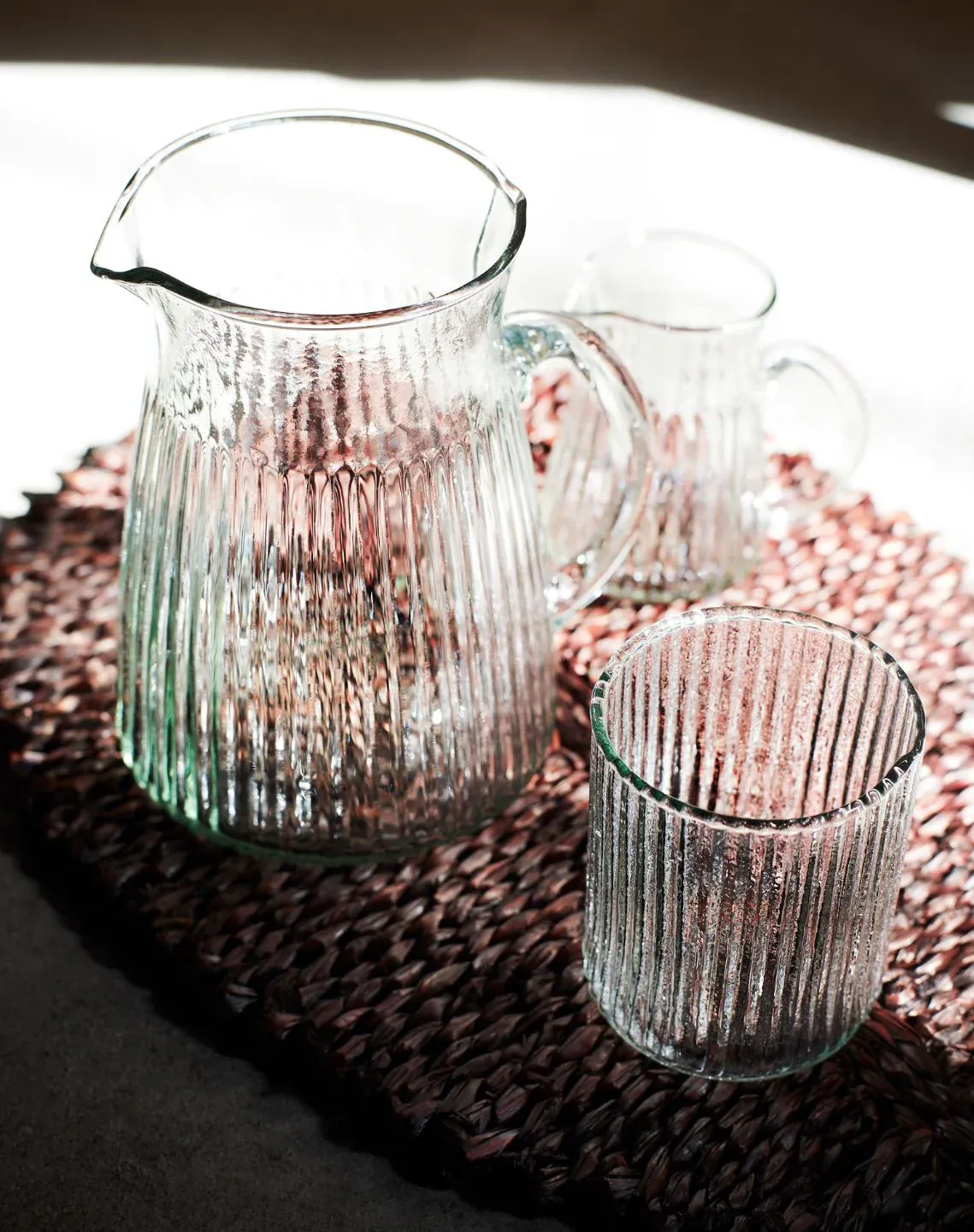Vaso con acabado de estrías, un diseño de vidrio reciclado con referencias al diseño de los años 60.